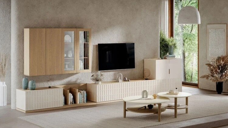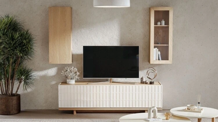 Gaia Yaşam Odası'nda kullanılan doğal meşe ile açık renk tonlarının yumuşak uyumu, TV ünitesine zamansız ve sade bir şıklık kazandırıyor. Zemine oturan formu sayesinde dengeli ve güçlü bir duruş sergileyen tasarım, modern çizgileriyle mekânla bütünleşiyor. Modüller arası geçişlerde kullanılan zarif detaylar, fonksiyonelliği estetikle birleştirirken sıcak renk paleti yaşam alanlarına yalın bir rahatlık katıyor.
