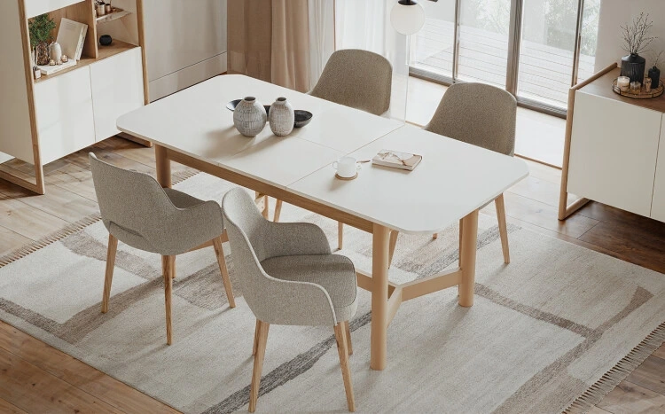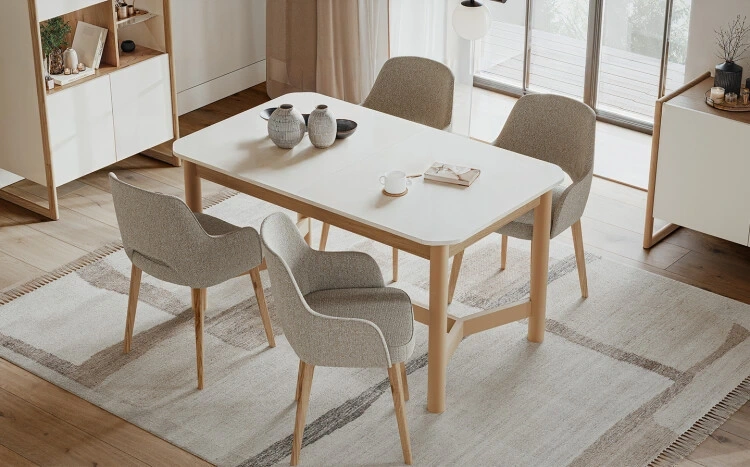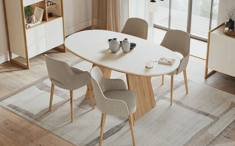 Modern tasarım anlayışı, doğal ahşabın sıcaklığıyla birleşerek evinize modern ve dengeli bir atmosfer katmayı amaçlıyor. Sabit yemek masasının üst tablasındaki oval hatlar, ayakların zarif birleşimiyle modern çizgileri ön plana çıkarıyor. Bu detaylar, hem estetik bir görünüm hem de fonksiyonel bir kullanım sunuyor.