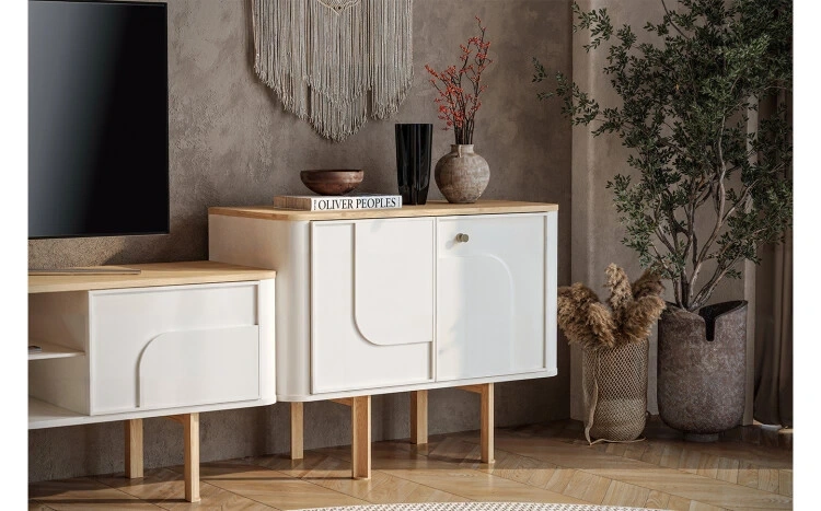 Üründe kullanılan profiller sayesinde yuvarlak hatlara sahip olan yaşam ünitesi, metal yuvarlak kulplarla tamamlanmış ahşap görünümlü patine boyalı metal ayaklarıyla yaşam alanlarınıza zamansız bir tasarım anlayışı katmaktadır. Üründe kullanılan meşe ve kırık beyaz tonlarındaki renk kombinasyonu yaşam alanlarında dingin bir aura yaratmayı hedeflemektedir.